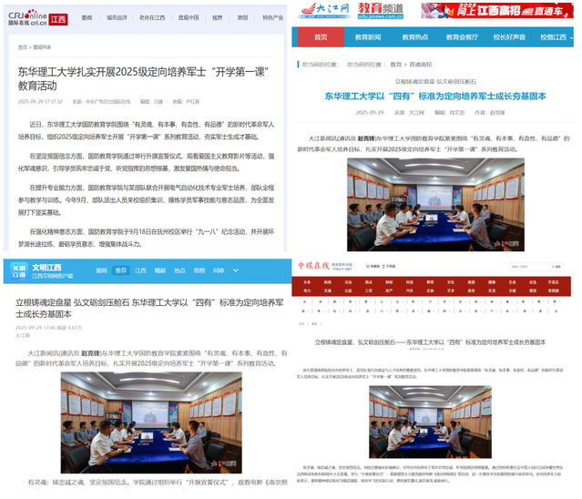 编者按:近日,东华理工大学国防教育学院紧紧围绕“有灵魂、有本事、有血性、有品德”的新时代革命军人培养目标,扎实开展2025级定向培养军士“开学第一课”系列教育活动。国际在线、大江网、文明江西、中媒在线等主流媒体对此进行报道,引发社会广泛关注。现将原文转载如下: