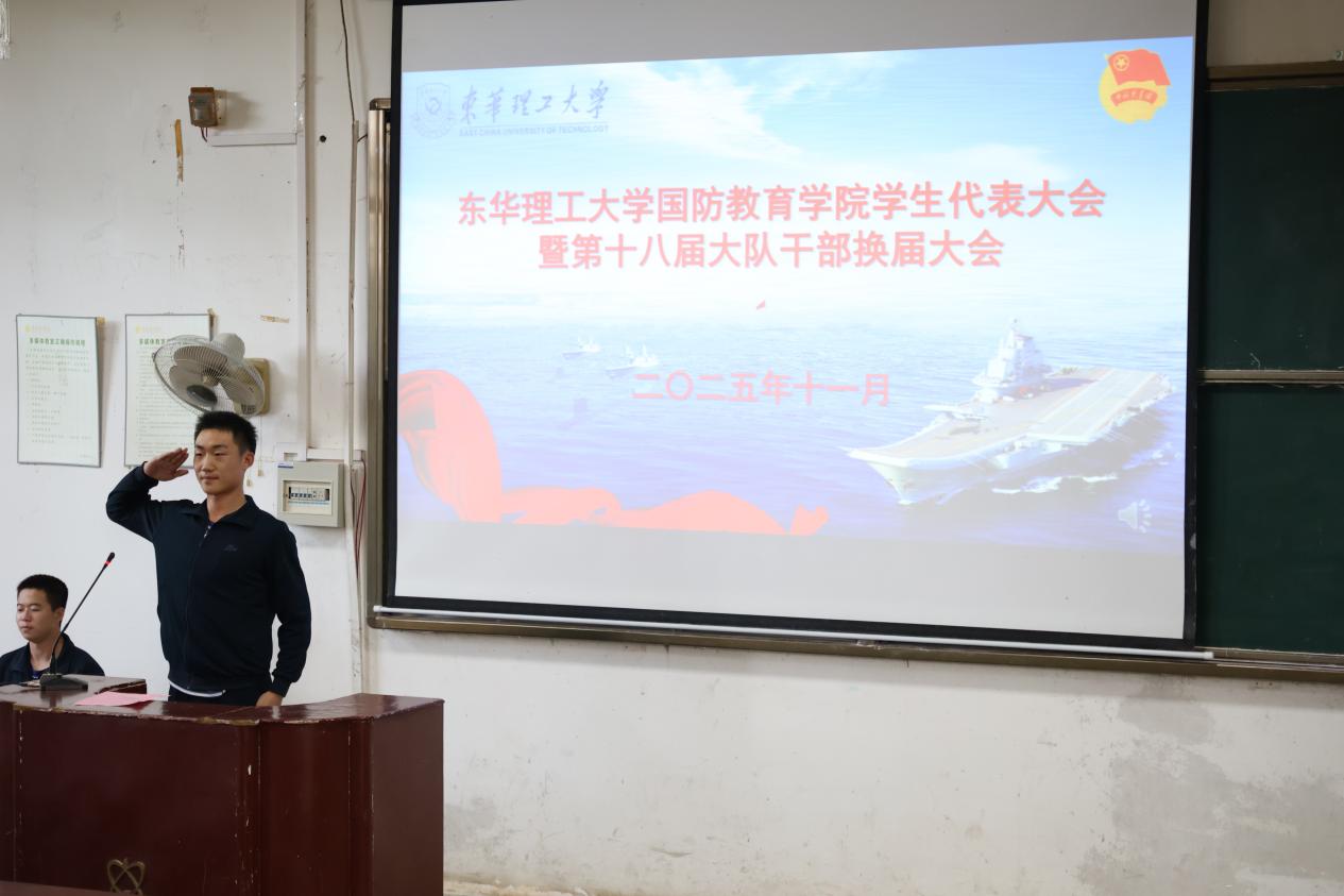 11月25日下午2时,国防教育学院在抚州学府校区信工楼阶六教室召开学生代表大会暨第十八届大队干部换届大会。学院党委书记赵克锋、组织员傅江辉、团委副书记郭佳磊、辅导员黄佳静、院第十七届大队干部及学生代表200余人参加此次大会。本次会议由郭佳磊主持。